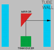 傳感器會發(fā)出超聲波脈沖,它會被旋轉鏡反射。同一傳感器接收水鋼接口和管后壁的反射。通過測量這些反射之間的飛行時間,可以測量壁厚.