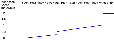 圖1.11顯示了用于檢測20mm管道通過時間(單通道系統(tǒng))中20%的塞壁裂紋的檢查速度圖。紅線顯示的物理極限是由超聲波需要通過材料時設定的。