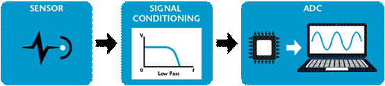 所有的數(shù)據(jù)采集系統(tǒng)都包括三個基本要素——傳感器、信號調(diào)理和模數(shù)轉(zhuǎn)換器(ADC)。