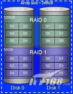 | RAID是英文Redundant Array of Inexpensive Disks的縮寫,中文簡稱為廉價磁盤冗余陣列。RAID就是一種由多塊硬盤構(gòu)成的冗余陣列。雖然RAID包含多塊硬盤,但是在操作系統(tǒng)下是作為一個獨立的大型存儲設備出現(xiàn)。利用RAID技術(shù)于存儲系統(tǒng)的好處主要有以下三種: 通過把多個磁盤組織在一起作為一個邏輯卷提供磁盤跨越功能; 通過把數(shù)據(jù)分成多個數(shù)據(jù)塊(Block)并行寫入/讀出多個磁盤以提高訪問磁盤的速度; 通過鏡像或校驗操作提供容錯能力; 最初開發(fā)RAID的主要目的是節(jié)省成本,當時幾塊小容量硬盤的價格總和要低于大容量的硬盤。目前來看RAID在節(jié)省成本方面的作用并不明顯,但是RAID可以充分發(fā)揮出多塊硬盤的優(yōu)勢,實現(xiàn)遠遠超出任何一塊單獨硬盤的速度和吞吐量。除了性能上的提高之外,RAID還可以提供良好的容錯能力,在任何一塊硬盤出現(xiàn)問題的情況下都可以繼續(xù)工作,不會受到損壞硬盤的影響。 RAID技術(shù)分為幾種不同的等級,分別可以提供不同的速度,安全性和性價比。根據(jù)實際情況選擇適當?shù)腞AID級別可以滿足用戶對存儲系統(tǒng)可用性、性能和容量的要求。常用的RAID級別有以下幾種:NRAID,JBOD,RAID0,RAID1,RAID0+1,RAID3,RAID5等。目前經(jīng)常使用的是RAID5和RAID(0+1)。 NRAID NRAID即Non-RAID,所有磁盤的容量組合成一個邏輯盤,沒有數(shù)據(jù)塊分條(no block stripping)。NRAID不提供數(shù)據(jù)冗余。要求至少一個磁盤。 JBOD JBOD代表Just a Bunch of Drives,磁盤控制器把每個物理磁盤看作獨立的磁盤,因此每個磁盤都是獨立的邏輯盤。JBOD也不提供數(shù)據(jù)冗余。要求至少一個磁盤。 RAID 0 RAID 0即Data Stripping(數(shù)據(jù)分條技術(shù))。整個邏輯盤的數(shù)據(jù)是被分條(stripped)分布在多個物理磁盤上,可以并行讀/寫,提供最快的速度,但沒有冗余能力。要求至少兩個磁盤。我們通過RAID 0可以獲得更大的單個邏輯盤的容量,且通過對多個磁盤的同時讀取獲得更高的存取速度。RAID 0首先考慮的是磁盤的速度和容量,忽略了安全,只要其中一個磁盤出了問題,那么整個陣列的數(shù)據(jù)都會不保了。 RAID 1 RAID 1,又稱鏡像方式,也就是數(shù)據(jù)的冗余。在整個鏡像過程中,只有一半的磁盤容量是有效的(另一半磁盤容量用來存放同樣的數(shù)據(jù))。同RAID 0相比,RAID 1首先考慮的是安全性,容量減半、速度不變。 RAID 0+1 為了達到既高速又安全,出現(xiàn)了RAID 10(或者叫RAID 0+1),可以把RAID 10簡單地理解成由多個磁盤組成的RAID 0陣列再進行鏡像。 RAID 3和RAID 5 RAID 3和RAID 5都是校驗方式。RAID 3的工作方式是用一塊磁盤存放校驗數(shù)據(jù)。由于任何數(shù)據(jù)的改變都要修改相應的數(shù)據(jù)校驗信息,存放數(shù)據(jù)的磁盤有好幾個且并行工作,而存放校驗數(shù)據(jù)的磁盤只有一個,這就帶來了校驗數(shù)據(jù)存放時的瓶頸。RAID 5的工作方式是將各個磁盤生成的數(shù)據(jù)校驗切成塊,分別存放到組成陣列的各個磁盤中去,這樣就緩解了校驗數(shù)據(jù)存放時所產(chǎn)生的瓶頸問題,但是分割數(shù)據(jù)及控制存放都要付出速度上的代價。 按照硬盤接口的不同,RAID分為SCSI RAID,IDE RAID和SATA RAID。其中,SCSI RAID主要用于要求高性能和高可靠性的服務器/工作站,而臺式機中主要采用IDE RAID和SATA RAID。 以前RAID功能主要依靠在主板上插接RAID控制卡實現(xiàn),而現(xiàn)在越來越多的主板都添加了板載RAID芯片直接實現(xiàn)RAID功能,目前主流的RAID芯片有HighPoint的HTP372和Promise的PDC20265R,而英特爾更進一步,直接在主板芯片組中支持RAID,其ICH5R南橋芯片中就內(nèi)置了SATA RAID功能,這也代表著未來板載RAID的發(fā)展方向---芯片組集成RAID。 Matrix RAID: Matrix RAID即所謂的“矩陣RAID”,是ICH6R南橋所支持的一種廉價的磁盤冗余技術(shù),是一種經(jīng)濟性高的新穎RAID解決方案。Matrix RAID技術(shù)的原理相當簡單,只需要兩塊硬盤就能實現(xiàn)了RAID 0和RAID 1磁盤陣列,并且不需要添加額外的RAID控制器,這正是我們普通用戶所期望的。Matrix RAID需要硬件層和軟件層同時支持才能實現(xiàn),硬件方面目前就是ICH6R南橋以及更高階的ICH6RW南橋,而Intel Application Acclerator軟件和Windows操作系統(tǒng)均對軟件層提供了支持。 Matrix RAID的原理就是將每個硬盤容量各分成兩部分(即:將一個硬盤虛擬成兩個子硬盤,這時子硬盤總數(shù)為4個),其中用兩個虛擬子硬盤來創(chuàng)建RAID0模式以提高效能,而其它兩個虛擬子硬盤則透過鏡像備份組成RAID 1用來備份數(shù)據(jù)。在Matrix RAID模式中數(shù)據(jù)存儲模式如下:兩個磁盤驅(qū)動器的第一部分被用來創(chuàng)建RAID 0陣列,主要用來存儲操作系統(tǒng)、應用程序和交換文件,這是因為磁盤開始的區(qū)域擁有較高的存取速度,Matrix RAID將RAID 0邏輯分割區(qū)置于硬盤前端(外圈)的主因,是可以讓需要效能的模塊得到最好的效能表現(xiàn);而兩個磁盤驅(qū)動器的第二部分用來創(chuàng)建RAID1模式,主要用來存儲用戶個人的文件和數(shù)據(jù)。 例如,使用兩塊120GB的硬盤,可以將兩塊硬盤的前60GB組成120GB的邏輯分割區(qū),然后剩下兩個60GB區(qū)塊組成一個60GB的數(shù)據(jù)備份分割區(qū)。像需要高效能、卻不需要安全性的應用,就可以安裝在RAID 0分割區(qū),而需要安全性