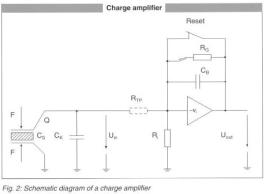 工作原理小的電量電荷需要轉(zhuǎn)化電壓(5V或10V)或電流(4…20mA)進行測試,例如在PC 或 PLC中。放大器通常用於測試技術(shù),因放大器是將電荷轉(zhuǎn)換成電壓。在原理上,電荷放大器包括MOS或J-FET電晶體的高增益電壓放大器,它能在輸入獲得高絕緣阻抗。放大器通過高絕緣電容連接到負反饋上。因此,放大器可以作積分器用於輸入電荷。對於傳感器,外加機械負載容易產(chǎn)生電荷變化。在輸出端顯示壓電傳感器電荷改變的積分和正比于整個電荷的改變(包括機械負載產(chǎn)生的電荷)的電壓信號。