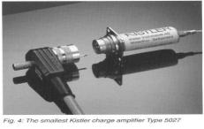 小型化Hybird技術(shù)使實際的電荷放大器變的更小更緊湊,他們能被非常近地裝在測試地點。直接放在機器上,因此縮短了傳感器和放大器之間的距離。Hybird技術(shù)也有安裝范圍。然而,可變測試范圍通過積分電壓放大器的方法來調(diào)節(jié)。當(dāng)前最小的電荷放大器Type 5027(Fig.4)只有45mm×16mm,有3個測試范圍。