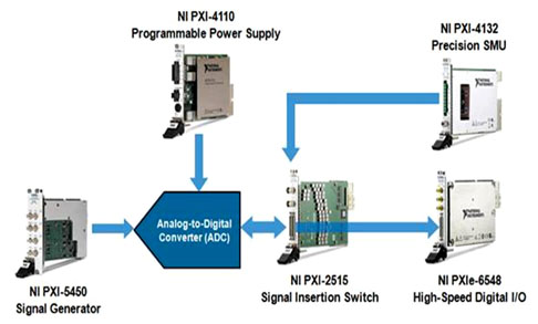 還有更多常見的特性描述作業(yè),包含DC參數(shù)量測(如數(shù)字接腳的各接腳泄漏與臨界值),而有時將需要奈安培或以下的量測分辨率。這時NI Semiconductor Suite的另一組組件--NI PXI-4132 SMU則具備10pA分辨率,且于較低敏感度時可達1kHz。當(dāng)搭配PXI-2515高速數(shù)字訊號植入切換器時,則可迅速切換一個或以上的SMU通道,不需衰減訊號亦可量測高頻寬的數(shù)字信道。最后還有一組ADC需要輸入功率與模擬激發(fā),則分別可由DC電源與任意波形產(chǎn)生器提供之。圖2則是安裝上述所有儀器的常見系統(tǒng)。
