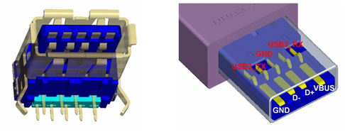 圖1 USB 3.0的A插孔(左)及插頭(右)