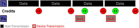 在超高速環(huán)境中,每個(gè)裝置都有兩組差動(dòng)對(duì),一組用于傳輸,一組用于接收,因此不會(huì)出現(xiàn)總線轉(zhuǎn)向失效時(shí)間,而發(fā)射器收到接收器發(fā)出的確認(rèn)前,也能夠進(jìn)行另一次傳輸。如此的變化使得收發(fā)器及接收器必須具備智能功能,以防范錯(cuò)誤發(fā)生。如果收發(fā)器收到的確認(rèn)訊息中表示接收的數(shù)據(jù)有誤,則必須重新傳輸先前的數(shù)據(jù)。通訊協(xié)議會(huì)使用點(diǎn)數(shù)來判斷收發(fā)器送出處理成功的ACK訊號(hào)之前,能夠一次處理的資料量,直到無法再傳輸/接收新數(shù)據(jù)為止。
