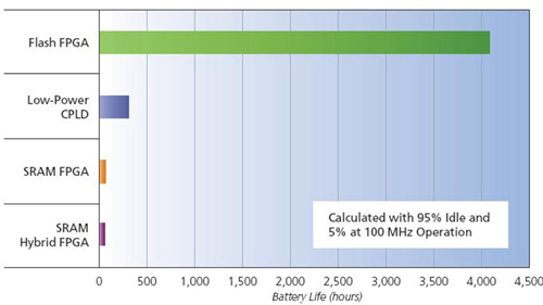 目前市場(chǎng)上有不少號(hào)稱低功耗的FPGA架構(gòu),但它們的耗電量高達(dá)30毫安(mA),這往往比典型的注重功率之電池供電應(yīng)用設(shè)備所能容忍的耗電量高出了一至二個(gè)數(shù)量級(jí)。與其它低功耗產(chǎn)品比較,以快閃技術(shù)為基礎(chǔ)的FPGA通常可將電池壽命延長(zhǎng)達(dá)十倍;若是專為低功耗應(yīng)用進(jìn)行最佳化的快閃式FPGA,每個(gè)輸入/輸出(I/O)的功耗更低至一般低功耗產(chǎn)品的十六分之一。圖2和圖3所示為不同組件的電池壽命延長(zhǎng)比較,相關(guān)數(shù)據(jù)來(lái)自廠商的功率分析工具軟件。