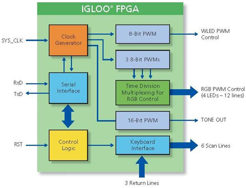 由于這些人機(jī)接口設(shè)計(jì)花樣百出,規(guī)格需求不一而足,因此具有靈活特性的FPGA組件自然也有一定的應(yīng)用利基,特別是具有超低靜態(tài)功耗與快速喚醒特性的快閃式FPGA,在此一領(lǐng)域的優(yōu)勢(shì)更是顯著。目前FPGA在人機(jī)接口設(shè)計(jì)的應(yīng)用有以下幾種主流,分別是執(zhí)行鍵盤控制等功能的客制化人機(jī)接口控制器、白光LED亮度控制、紅綠藍(lán)三色LED顏色混合、音調(diào)產(chǎn)生器等功能。其中后三者的共同元素為脈沖寬度調(diào)變(PWM)技術(shù),這也是一種混合信號(hào)的應(yīng)用。圖6所示的設(shè)計(jì)能夠在單一快閃FPGA上實(shí)現(xiàn)多種人機(jī)接口控制功能。