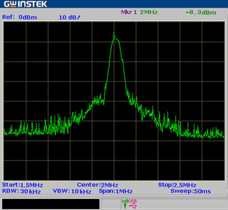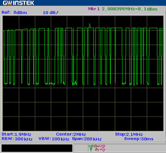 測(cè)量信號(hào)頻率時(shí),可以打開峰值保持,將中心頻率設(shè)在2MHz。頻率跨度的選擇須考慮與解析頻寬(RBW)的搭配,若測(cè)量范圍(SPAN)和RBW相差很大,加上信號(hào)擷取困難,測(cè)得頻率所需時(shí)間會(huì)非常長(zhǎng);若SPAN和RBW相差很小,則容易造成頻率測(cè)量不準(zhǔn)確。可選擇30kHz的RBW和1MHz的SPAN,在這種情況下,頻譜分析儀不能保證對(duì)每一個(gè)瞬時(shí)信號(hào)都能成功擷取,所以在頻譜分析儀上看到的頻譜變化間隔往往大于2秒,這是由于SPAN大于RBW時(shí),若信號(hào)進(jìn)入頻譜分析儀時(shí)其實(shí)時(shí)掃描的頻率偏離信號(hào)真實(shí)頻率,則信號(hào)將無(wú)法被擷取,但經(jīng)過稍長(zhǎng)的一段時(shí)間(取決于SPAN和RBW之差)后,依然能在峰值保持的模式下觀察到信號(hào)累積的頻譜情況,根據(jù)此一圖像可輕易透過搜索峰值讀出信號(hào)頻譜中心點(diǎn)的頻率,精準(zhǔn)度可以達(dá)到kHz的級(jí)別,如圖3所示,測(cè)得信號(hào)頻率為2.0MHz。