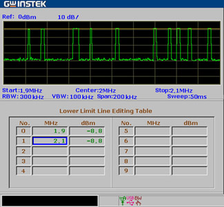 另外,可在頻譜分析儀上設(shè)置通過/失敗(Pass/Fail)的功率限制線(Limit Line),如圖5所示,使功率滿足限制范圍的信號(hào)(產(chǎn)品)通過。這一應(yīng)用只須在2.2.2的設(shè)置基礎(chǔ)上進(jìn)入限制線菜單進(jìn)行Pass/Fail功能設(shè)置即可,廠商分析儀產(chǎn)品限制線菜單的設(shè)置靈活,可以方便地編輯使用者須設(shè)定的功率上限和下限。限制線透過表格形式編輯在線的各點(diǎn),各點(diǎn)連成的限制曲線可滿足使用者在不同頻率點(diǎn)有不同功率標(biāo)準(zhǔn)的需要,而非簡(jiǎn)單的直線,透過簡(jiǎn)單幾個(gè)鍵的設(shè)置,頻譜分析儀即能幫助使用者將符合要求的信號(hào)判定為通過,而所有不符合要求的信號(hào)都將被準(zhǔn)確無(wú)誤地判定為失敗,圖6所示為通過測(cè)試時(shí)頻譜儀顯示的畫面。