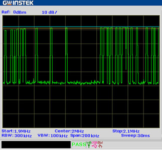 若要通過測(cè)試,首要的要求是每一次信號(hào)都要被擷取,亦即RBW須大于等于SPAN,若產(chǎn)線對(duì)頻率的準(zhǔn)確度要求在幾十kHz的范圍內(nèi),而對(duì)功率要求較高,如零點(diǎn)幾dBm,則可設(shè)置對(duì)于信號(hào)功率要求的通過測(cè)試。