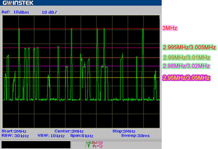 一般產(chǎn)線對(duì)信號(hào)的頻率和功率同時(shí)都有較嚴(yán)格的要求,分別進(jìn)行功率、頻率通過測(cè)試的方法在實(shí)際運(yùn)用中還是稍顯繁瑣,這里推薦另外一種綜合測(cè)試的方法,其特點(diǎn)是首先將SPAN設(shè)置為零頻跨,將擷取的信號(hào)的持續(xù)時(shí)間設(shè)為500微秒、頻率設(shè)為3MHz的信號(hào)、功率1dBm與發(fā)送間隔為1秒,然后利用信號(hào)產(chǎn)生器將信號(hào)的頻率在3MHz附近調(diào)整。由于中心頻率3MHz,零頻跨的頻譜分析儀掃描的范圍只在3MHz這一點(diǎn)上,根據(jù)濾波器的特性,有微小頻率偏移的信號(hào)擷取后的功率會(huì)被衰減,分別將信號(hào)的頻率以3MHz為中心左右調(diào)偏50kHz、100kHz、200kHz和500kHz,信號(hào)衰減后的功率幅度如圖7所示。