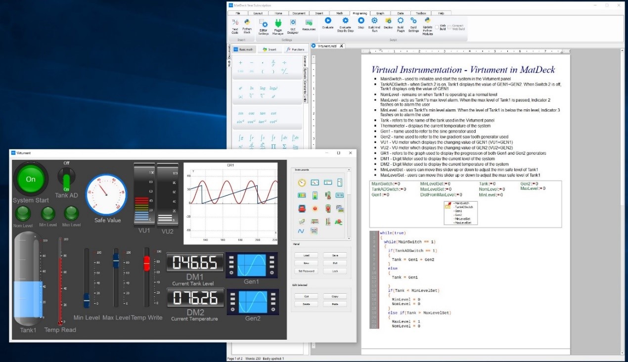 Virtument 是 MatDeck 虛擬儀表板,它允許使用數(shù)字儀表、滑塊、水箱、儀表等視覺(jué)輔助工具在設(shè)備和 MatDeck 之間進(jìn)行通信。Virtument 是一個(gè)無(wú)代碼工具箱,這意味著不需要編程知識(shí),因?yàn)橛脩?hù)只需單擊幾個(gè)按鈕即可創(chuàng)建與設(shè)備的連接并向其添加虛擬儀器。然而,用戶(hù)可以選擇添加代碼、GUI 和功能來(lái)使用虛擬儀器。