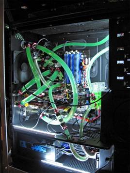 幾乎所有東西都是水冷的:主CPU、兩個視頻卡、北橋、南橋,甚至一些Mosfets。