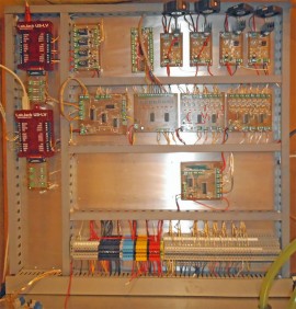 右側(cè)的3個中心板是用于模擬輸入的溫度傳感器調(diào)節(jié)器和濾波器板。左上角是一個繼電器板,用于打開/關(guān)閉風(fēng)扇的電源。旁邊是PWM模擬風(fēng)扇控制器。底部的單獨板清理和去抖動流量脈沖信號,中間左側(cè)是一個多路復(fù)用板,它將流量轉(zhuǎn)速信號饋送到1個計數(shù)器。3條數(shù)字I/O線切換多路復(fù)用板以解決要測量的流量脈沖。