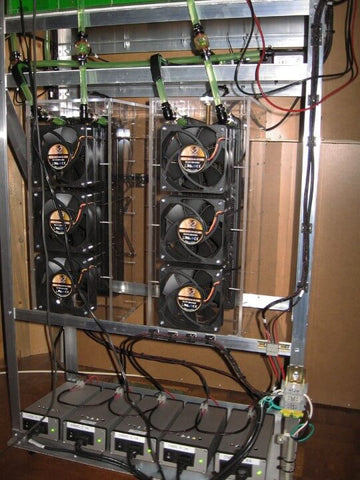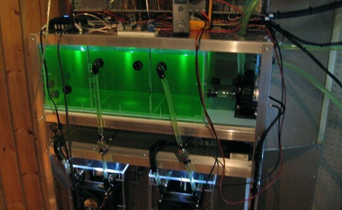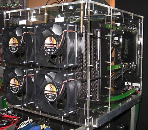 右邊地板上的藍(lán)色隔熱水箱是一個標(biāo)準(zhǔn)的25加侖魚缸,水箱內(nèi)部是兩個標(biāo)準(zhǔn)水族箱泵。一個將流體泵送到右下角很難看到的冷卻器,另一個將流體泵送到板式熱交換器。一些管道覆蓋有絕緣層以幫助防止冷凝。另請注意(左上角)HVAC系統(tǒng)通過管道連接到散熱器和板式換熱器箱中,以預(yù)冷空氣。