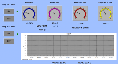 主屏幕顯示室溫、濕度和露點,以便在發(fā)生冷凝時一目了然。ReservoirTemp是Mosfet回路的回路5的溫度。Loop air in temp是被推入電腦支架頂部亞克力盒的空氣溫度。然后是手動散熱器開/關(guān)風(fēng)扇控制按鈕。