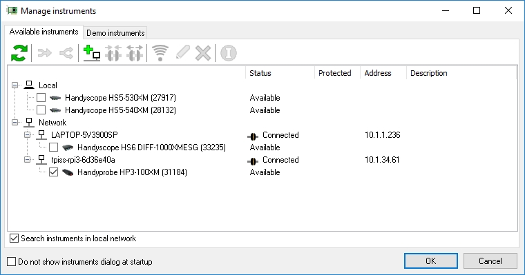 使用帶有以太網(wǎng)連接(LAN、WiFi 或 WAN)的 Handyscope 系列示波器進行遠程測量非常透明,以致于看起來連接以太網(wǎng)的儀器直接連接到 PC。多通道示波器軟件默認支持以太網(wǎng)連接的儀器。示波器、頻譜分析儀、數(shù)據(jù)記錄器和電壓表的所有軟件和硬件功能仍可通過網(wǎng)絡(luò)使用。不需要特定的網(wǎng)絡(luò)知識??捎脙x器的對話框顯示網(wǎng)絡(luò)儀器。只需打勾,即可開始測量。 TiePie 的工程格言再次適用:即插即測 示波器