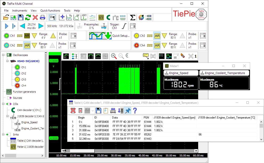 圖4:J1939/CAN總線信號、解碼的CAN消息和J1939值圖4顯示了被測量的差速器hs4Dff測量的差速器可以信號。解碼后的CAN消息顯示在 桌子 .從CAN消息解碼的J1939值被添加到表中,并在 米 顯示。