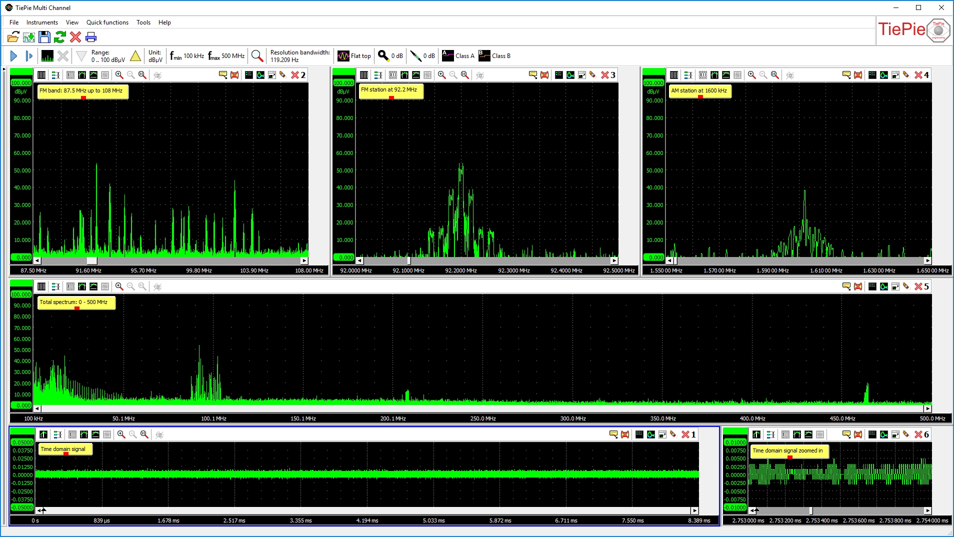 圖4顯示了用放在外面的共混天線測量的光譜。在0赫茲至500兆赫的全頻譜旁邊,還有87.5兆赫至108兆赫的調(diào)頻頻帶、92.2兆赫的調(diào)頻廣播電臺,甚至是1600千赫的AM廣播電臺。還顯示了時(shí)域信號,以及部分時(shí)間域信號的放大。所有的窗口都是實(shí)時(shí)的,不同頻率之間的相關(guān)性和時(shí)域信號可以方便地查看。EMI分析器的多窗口功能提供了用戶無限的分析和顯示能力。