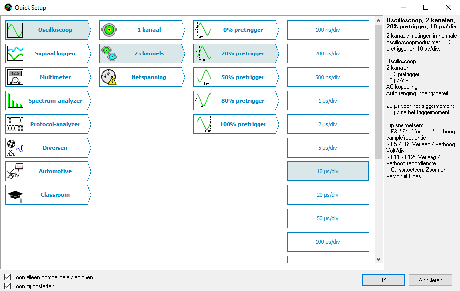 為了簡化測量設(shè)置,多通道示波器軟件具有大量快速設(shè)置,幾乎適用于所有應(yīng)用??焖僭O(shè)置包含特定測量的所有基本設(shè)置以及與所選快速設(shè)置相關(guān)的附加信息,例如如何連接儀器和/或附件??焖僭O(shè)置還可以包括參考示例信號。閱讀快速設(shè)置后,可以立即進行相關(guān)測量,或者根據(jù)需要對設(shè)置進行微調(diào)。