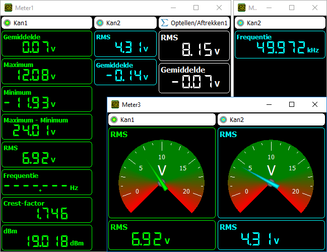 萬用表可用于測量或監(jiān)視信號的特定屬性,例如有效值、頻率、最大值等。多通道示波器軟件萬用表可以具有任意數(shù)量的完全可配置的顯示器,這些顯示器將測量值顯示為數(shù)字或通過帶有指針的時鐘。當(dāng)將電路調(diào)整到某個值(例如偏移為零)時,帶有指針的時鐘顯示非常有用。