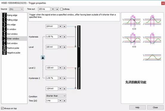 上升沿、下降沿、任何沿、內(nèi)部窗口、外部窗口、進(jìn)入窗口、退出窗口、脈沖寬度