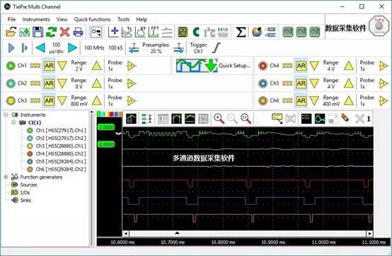 使用強(qiáng)大的多通道數(shù)據(jù)采集卡軟件,無(wú)線數(shù)據(jù)采集卡也可以當(dāng)作示波器、頻譜分析儀、數(shù)據(jù)記錄器、萬(wàn)用表、任意波形發(fā)生器和協(xié)議分析儀用。該軟件包括70多個(gè)快速設(shè)置,可以在一次單擊中配置無(wú)線數(shù)據(jù)采集卡進(jìn)行采集??焖僭O(shè)置的方法以樹(shù)狀結(jié)構(gòu)圖顯示,按應(yīng)用程序精心排序。只需點(diǎn)擊幾下鼠標(biāo)就可以進(jìn)行復(fù)雜的數(shù)據(jù)采集。