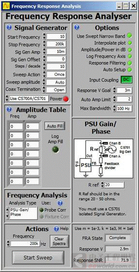 CS320A-FRA是一款高性價(jià)比的頻率響應(yīng)分析儀,由新西蘭CleverScope公司研發(fā)生產(chǎn),CleverScope公司以其虛擬示波器而著名于世。 CS320A-FRA信號(hào)產(chǎn)生部分:內(nèi)置CS701信號(hào)發(fā)生器(1mHz-65MHz,正弦波信號(hào),輸出幅度0-7Vpp),輸出部分具有隔離輸出(300V CAT III),不需要外部隔離變壓器就就可以進(jìn)行頻率響應(yīng)分析。CS320A-FRA接收部分:就是一款USB數(shù)字示波器,10(可以升級(jí)到14位)ADC,100MSa/s采樣速率,2個(gè)模擬通道,4M存儲(chǔ)深度。每個(gè)通道都具備DFT窄帶濾波器功能,實(shí)現(xiàn)高達(dá)100dB的動(dòng)態(tài)范圍。增益精度0.05dB,相位精度0.1°。分析軟件可以做伯德圖,阻抗圖,PSRR曲線圖顯示,數(shù)據(jù)可以存儲(chǔ)成文本