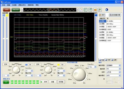 MSV-2102的數(shù)字示波器提供200MSa/s實(shí)時(shí)采樣,60M帶寬,每通道512k深度,以及邊沿、斜率、脈寬、交替、外觸發(fā)等多種觸發(fā)方式。邏輯分析儀100MSa/s實(shí)時(shí)采樣,100M帶寬,存儲(chǔ)256k,電平0-5V可調(diào),并提供了總線分析、分組測(cè)量、邏輯量測(cè)量、時(shí)間測(cè)量等。