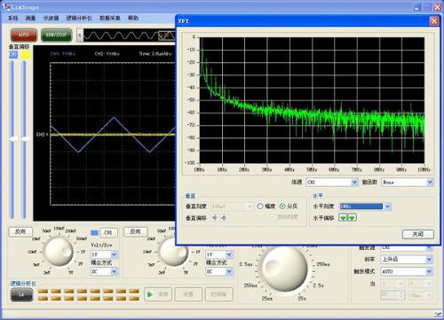 頻域分析功能。顯示FFT幅度譜,可選多種窗函數(shù),具有水平和垂直展開(kāi)功能,可以觀察頻域細(xì)節(jié)。