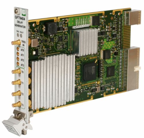 The GFT9404 module provides four independent delay channels (T0 to T3). The delay resolution is 1 ps, and external trigger to channel jitter is less than 50 ps. SMB outputs deliver 5 V, 2 ns rise time, under 50 . Amplitude and width are adjustable on each output pulse. The GFT9404 also provides four auxiliary delay channels to the front panel (AT0 to AT3). The copy of these four channels is provided on the PXI bus (PXI trig 0 to PXI trig 3). The delay resolution is 5 ns (one time base clock) and trigger to channel jitter is 100ps. One input trigger (TRIG IN), PXI STAR trigger, or internal frequency is used to trigger all output channels.
