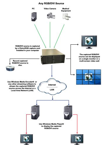 可使用DMA拷貝到主機系統(tǒng)進行顯示,存儲或流傳輸。只要 RGB或DVI 數據在非Datapath圖形卡上顯示, Vision RGB-X2就會把數據發(fā)送到系統(tǒng)內存上, 然后操作系統(tǒng)將數據拷貝到顯示器上.在使用Datapath 圖形卡時, Vision RGB-X2 直接傳輸數據到圖形卡從而增強性能。Vision RGB-X2將采集的數據部分發(fā)送到每一個視頻通道,并指示每個通道使用其圖形引擎更新發(fā)送數據. 這樣就利用硬件大大提高了性能。英國Datapath公司的VisionRGB- X2卡是一款應用于實時采集模擬或DVI源的理想解決方案。其典型的應用包括: