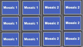 例如:如果是一個4×3的視頻/數(shù)據(jù)拼接墻,采用3片Horizon-4VW-DIG/iH4-DIG圖形多屏卡組成,并安裝兩片Mosaic卡。每片Mosaic卡被設(shè)定覆蓋一半的拼接墻。因此,第一片Mosaic卡將會在左邊的6個屏中顯示操作,第二片Mosaic卡則會在右邊的6個屏中顯示操作(如圖所示)。
