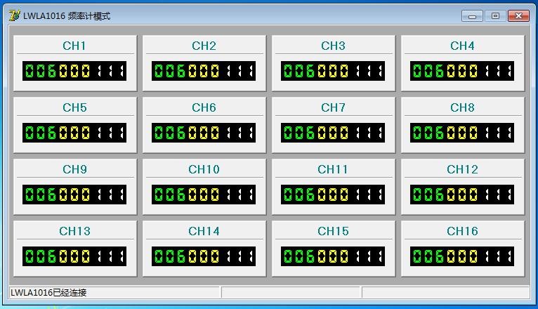 16,實(shí)現(xiàn)了多路頻率計(jì),我們編寫了專門的軟件界面,與LWLA1016連接,同時(shí)采集16路數(shù)據(jù) 并實(shí)時(shí)顯示。由于采用了異步計(jì)數(shù)器,將被測量信號當(dāng)做始終信號以控制累加寄存器測量周期,頻率計(jì)上限為250M(實(shí)測)。界面簡潔明了,如下圖:(綠色代表MHZ 黃色代表KHZ 白色代表HZ)
