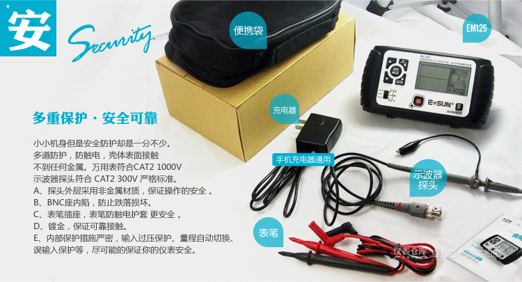 K-125系列手持式數(shù)字示波表是一款便攜式的波形測量工具。替代模擬示波器和臺式的數(shù)字示波器以及數(shù)字萬用表,在現(xiàn)場和教學(xué)等領(lǐng)域是最好的觀測工具。它采用高速AD采樣器,把被測輸入的模擬信號轉(zhuǎn)換為數(shù)字信號經(jīng)過高速CPU的處理顯示在128*64的LCD屏上。高速比較器,獲得良好的邊沿觸發(fā),穩(wěn)定的顯示便于觀測。萬用表采用6000計數(shù)的高精度專用芯片,精度更高。配備大容量鋰電池,節(jié)能設(shè)計使本機充電一次可以工作10小時以上。充電器采用標準的手機充電器,讓你在任何地方都可以方面使用。